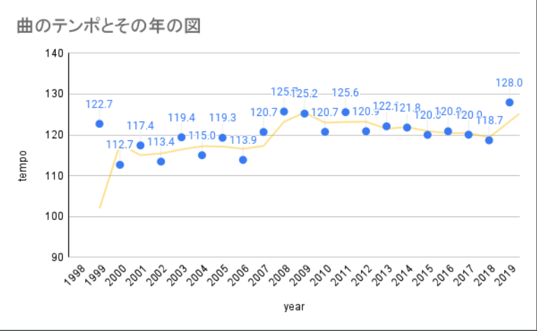 テーマは最近の音楽の変化をデータに基づいて分析しています。テンポの違いは次の表から分析しています。