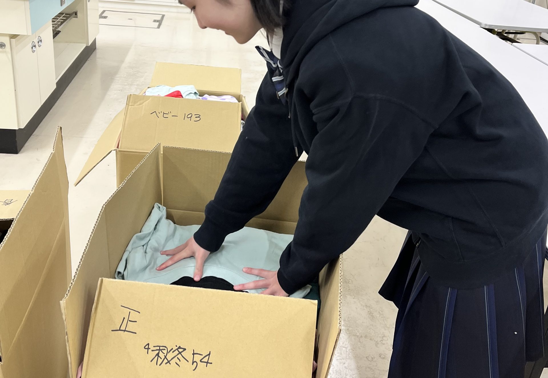今年は、本部の方をお招きし、出張授業という形で、取り組みの背景や世界の現状、SDGsについて学びました。その後、校内や地域の皆さまにご協力いただき、着なくなった子ども服の回収を行いました。